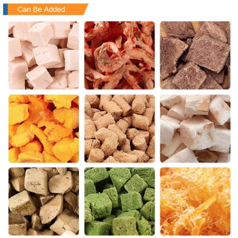 Fresh chicken (35%), frozen beef (17%), chicken meal (15%), frozen duck meat (10%), tuna powder (6%), purple sweet potato, peas,chicken fat, compound seasoning for pet feed,freeze - dried chicken (2%), freeze - dried raw meat and bones (2%), flaxseed oil,evening primrose oil, egg powder, apple, papaya, carrot powder, pumpkin, tomato powder, fish oil (1%), bovine colostrum (0.2%),plantain seeds, yucca, aloe vera powder (0.05%). Zinc sulfate, copper sulfate, manganese sulfate, ferrous sulfate, magnesium sulfate, choline chloride, potassium chloride, fructooligosaccharide, calcium hydrogen phosphate,mannooligosaccharide, chondroitin sulfate, lecithin, DL - A - tocopherol,hyaluronic acid, β - carotene, L - carnitine, DL - methionine, L - lysine, taurine, vitamin A, vitamin D3, vitamin E, vitamin K,vitamin C, vitamin B1, riboflavin, niacin, pyridoxine hydrochloride, D - biotin, folic acid, vitamin B12.